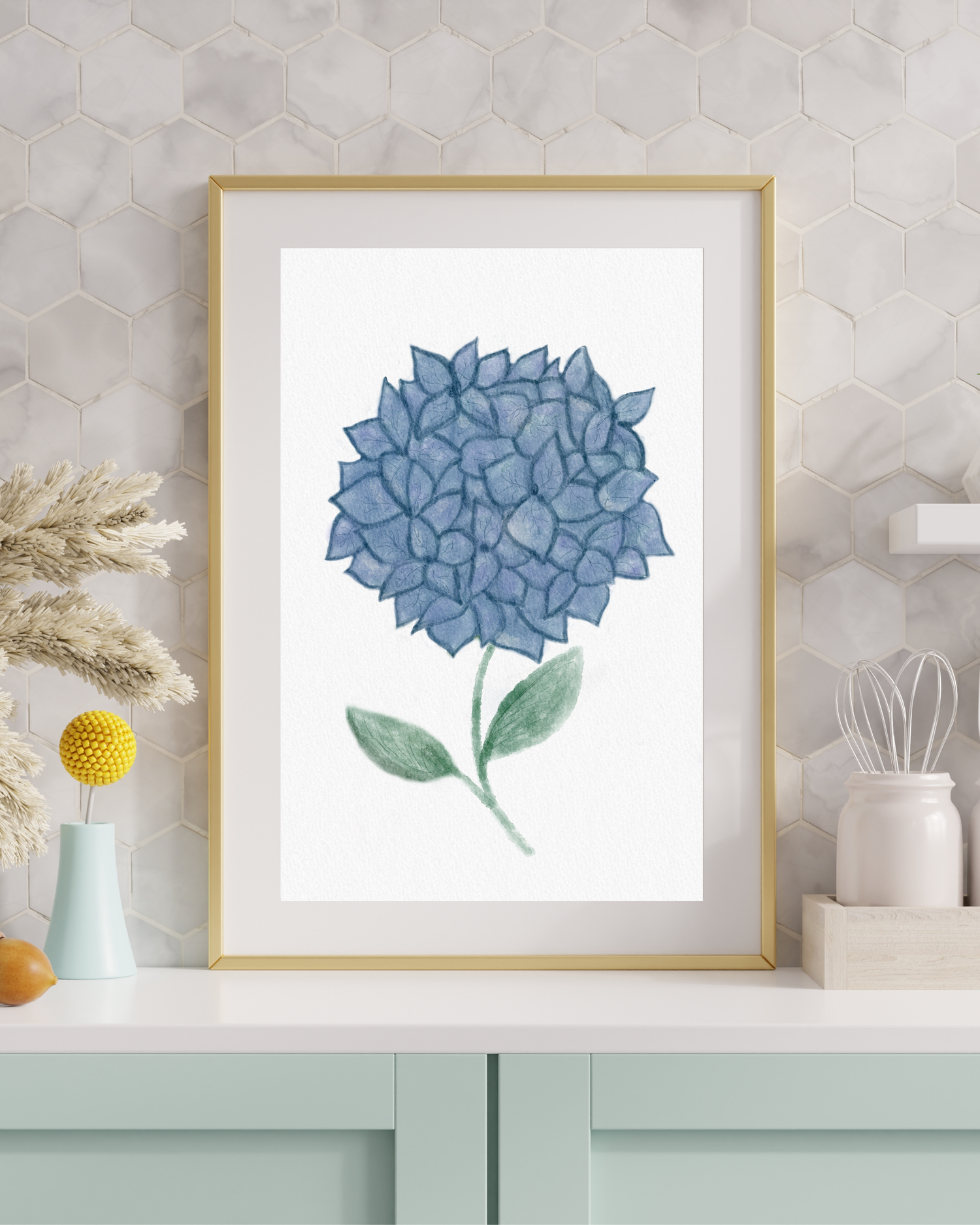 Hand Drawn Blue Hydrangea Watercolor Art – Digital Wall Art Download (8×10, 300 DPI)